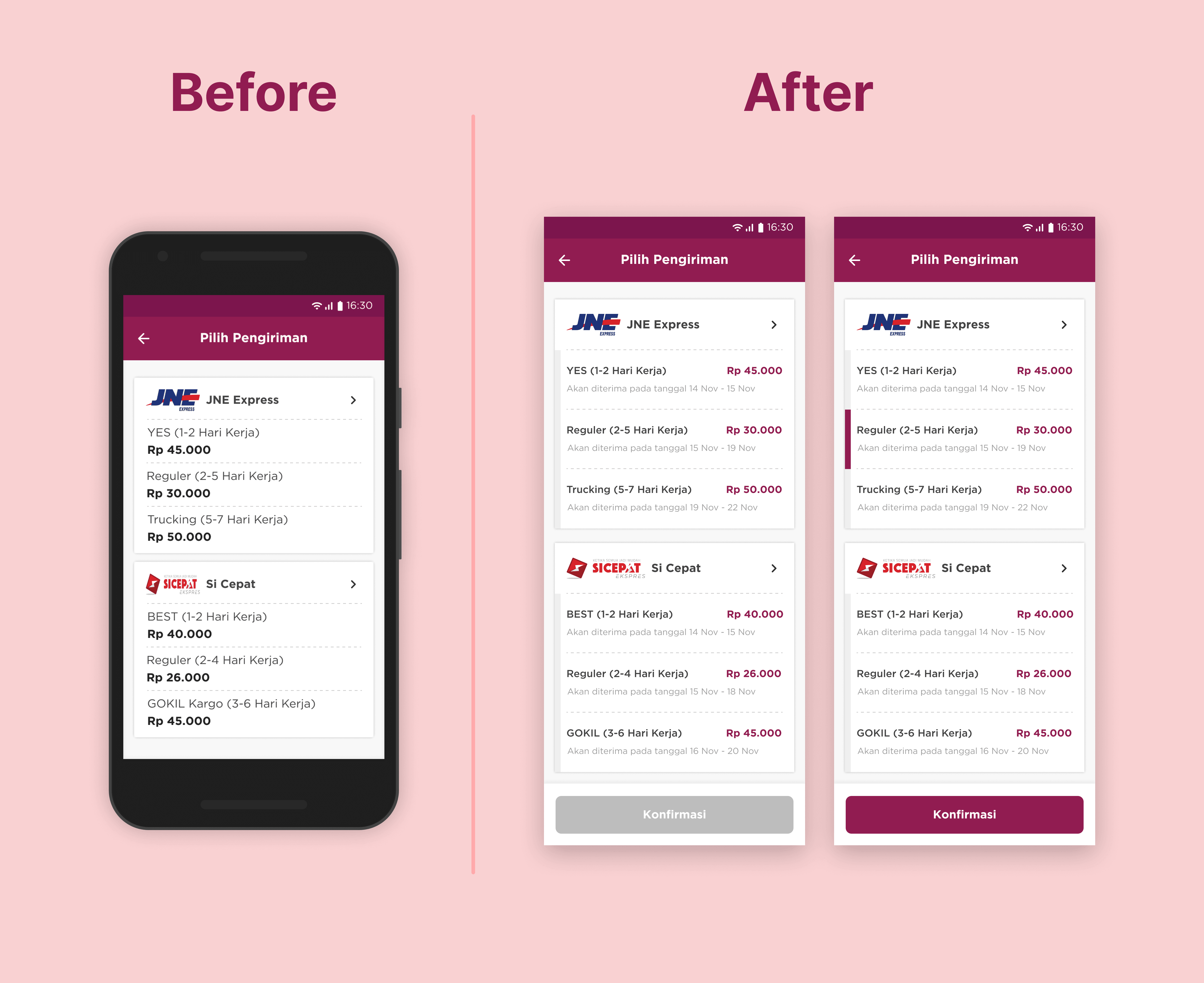 The image above is a design page that we have created for the design iteration of the shipping options, here we add the estimated date of the Product to arrive. In addition, we also added a confirmation button and a special marker on the selected delivery section so that users don’t feel confused.