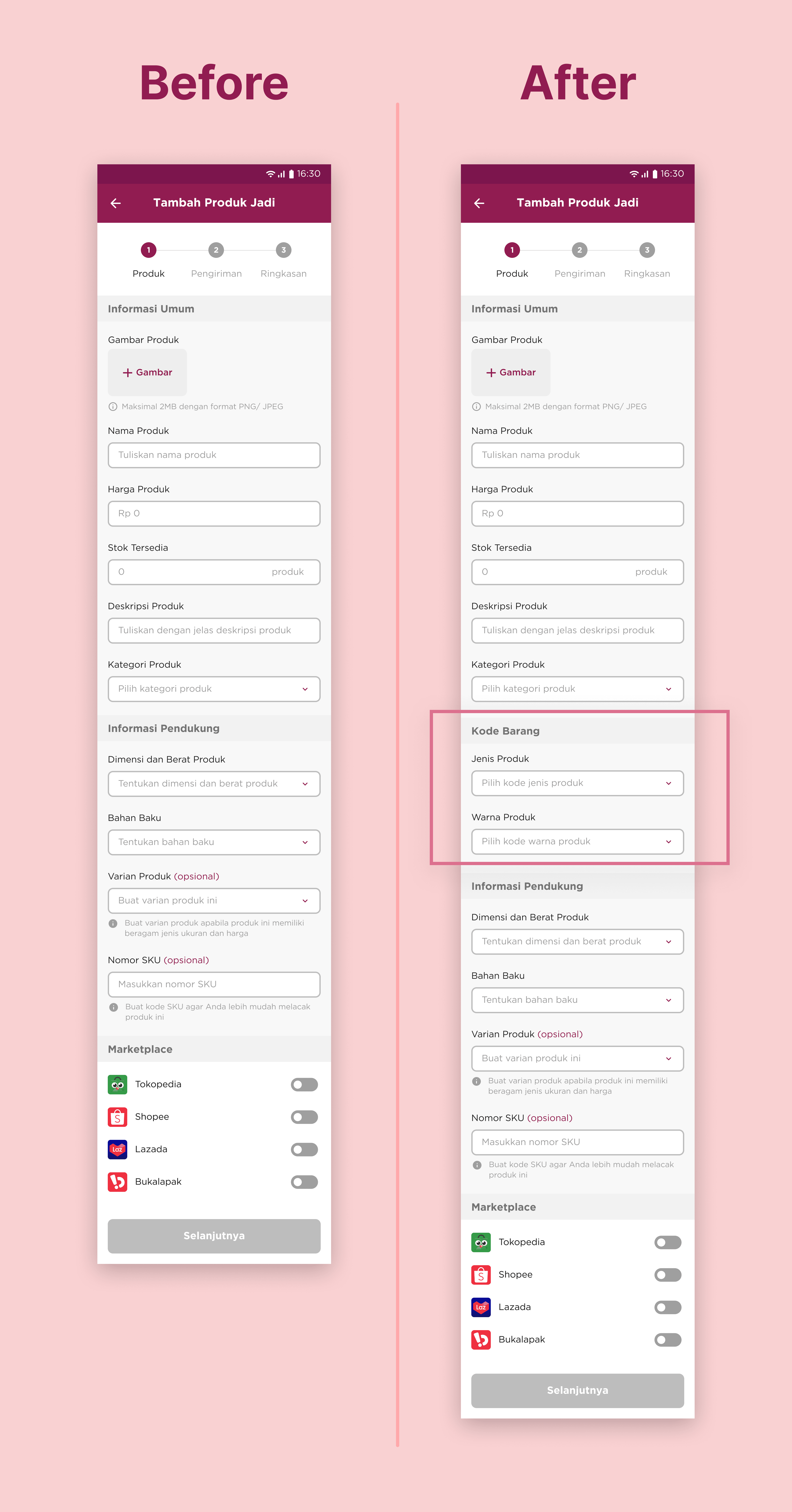 The image above is a design page that we have created for the design iteration of adding finished products, here we add a section for item codes so that users who have varied products can give each product a specific code.