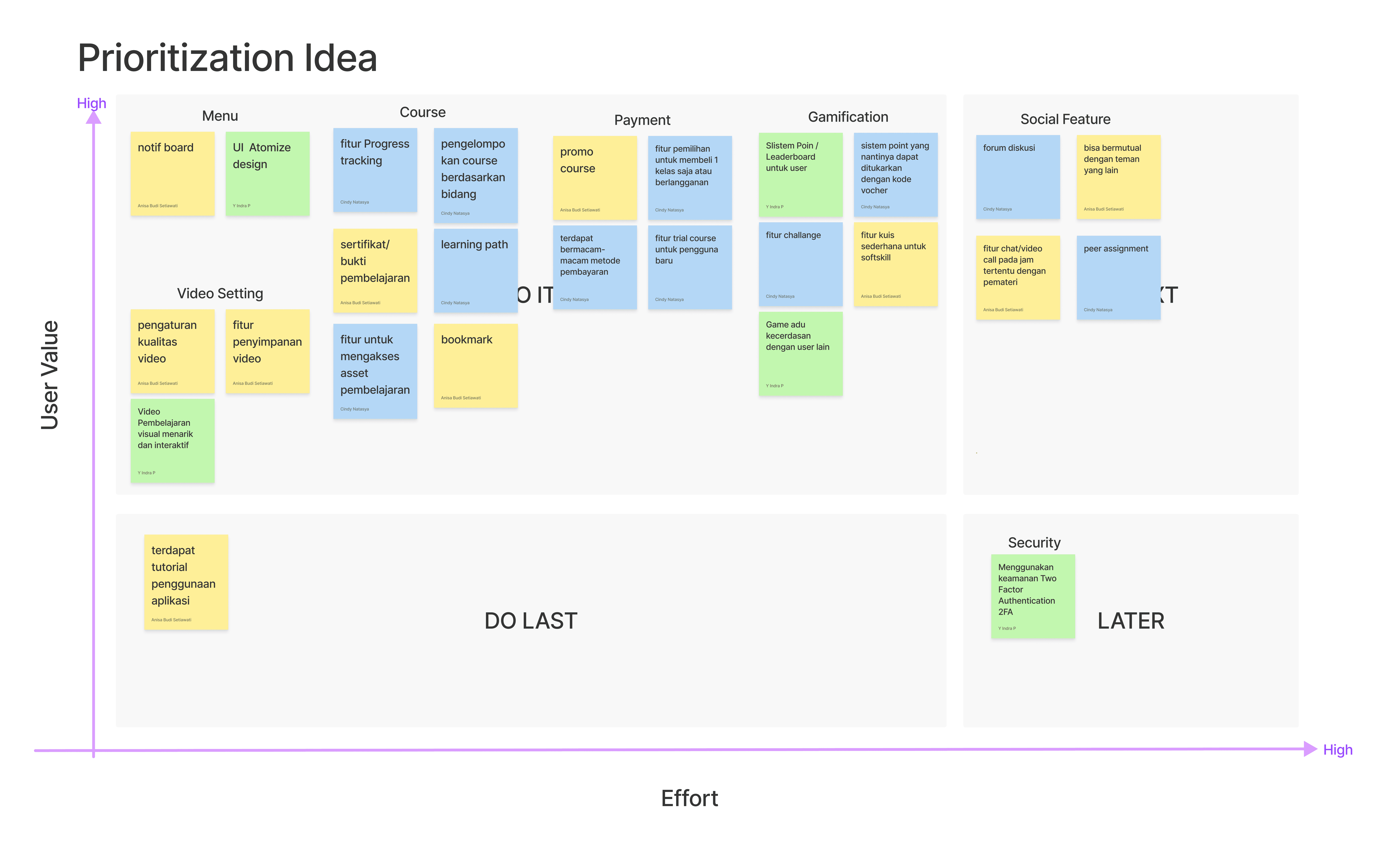 After brainstormed and collected all the possible solutions, I created an Prioritization Idea to map each solution on the affinity diagram and determine the level of impact and effort. Through these tools, I can identify which features are potential to be developed and which features are better to be left.