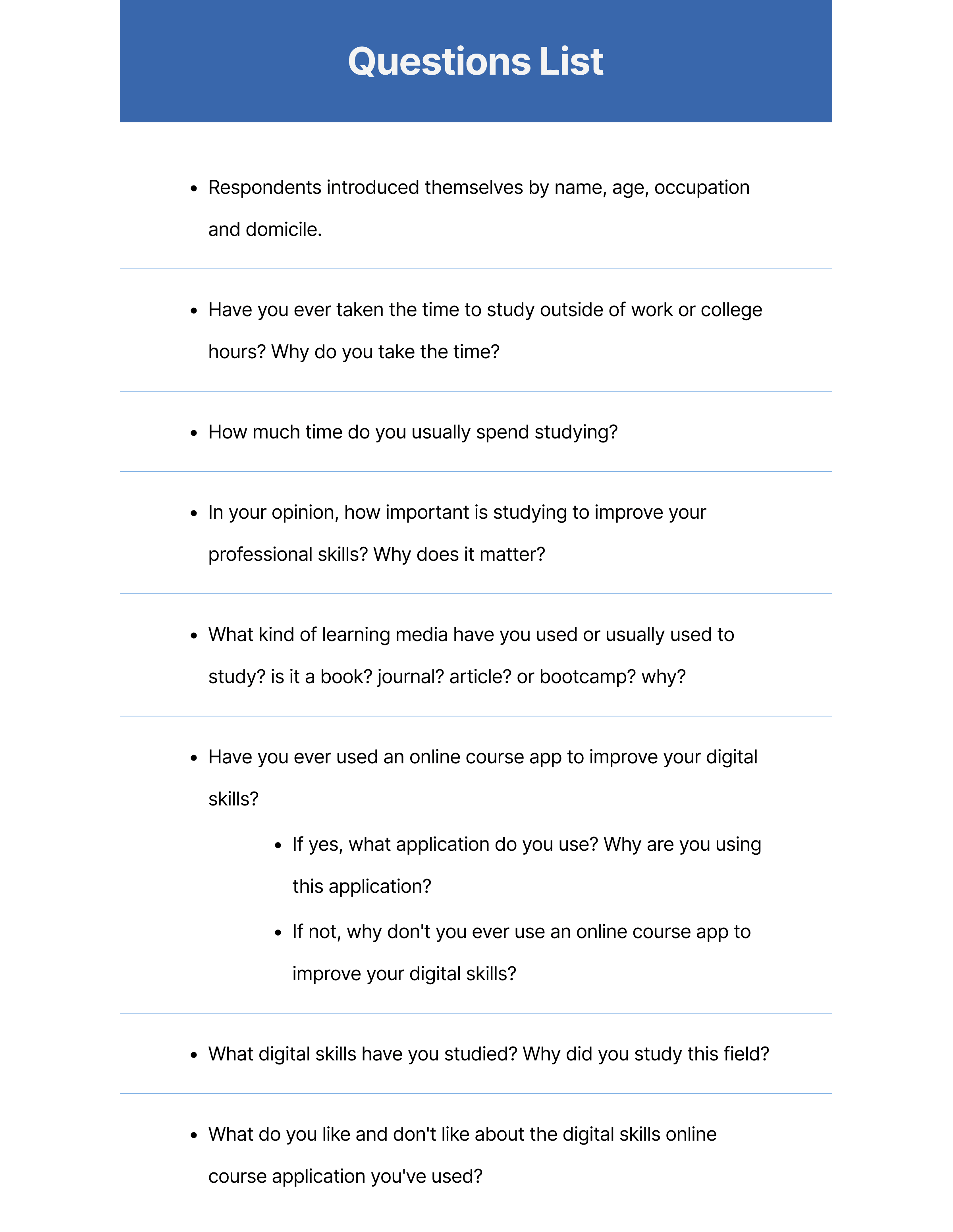 After doing research on a few competitors, I also did research with an in-depth interview method with one of the users based on predetermined user criteria. The interview was conducted through the Google Meet platform. Before conducting user interviews, I have to determine the data I want to collect, as follows: