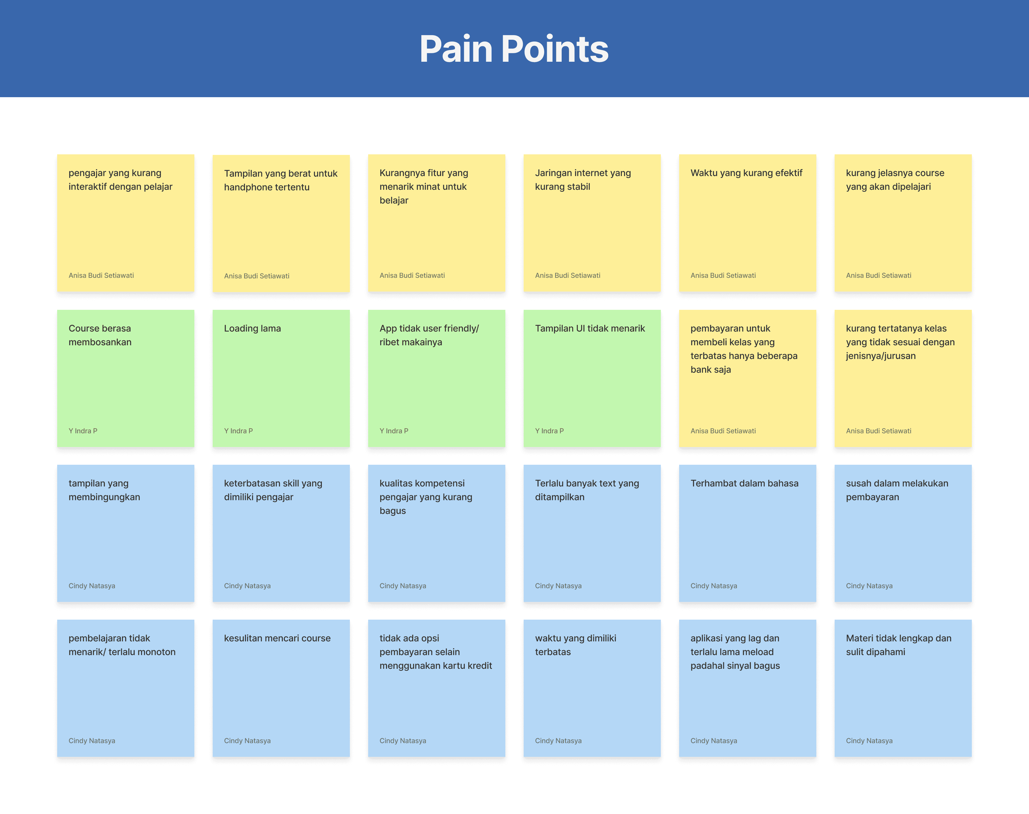 Pain points that often arise when using online learning applications are the difficulty of interacting with mentors, limited payment methods, low learning motivation, and other related learning processes.
